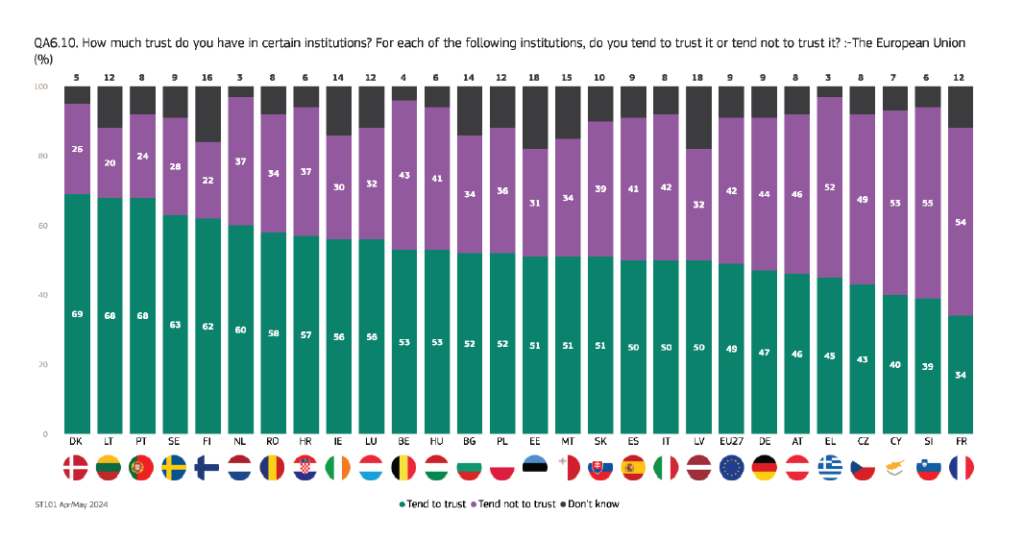 One indicator of the French electorate’s attitude towards the EU is institutional trust. The Eurobarometer of Spring 2024 results on trust in EU institutions (Image 1.0) indicate that France, although being one of the biggest countries in the EU and one of its founding members, shows the lowest level of trust in EU institutions (Eurobarometer, 2024). In addition, the dissatisfaction is higher than the rest of the European Union, with more than 10 percentage points more than the general EU citizens (27% compared to 17%) (European Parliament, 2024) as shown in the same study as image.1.
